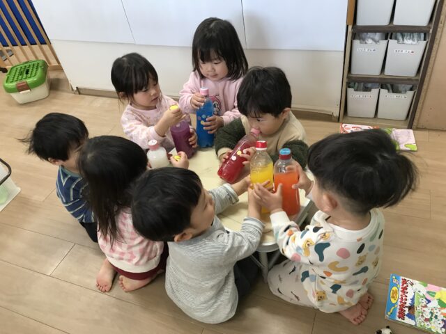 登園すると、色々なジュースに遊び始めました♪「かんぱーい!」