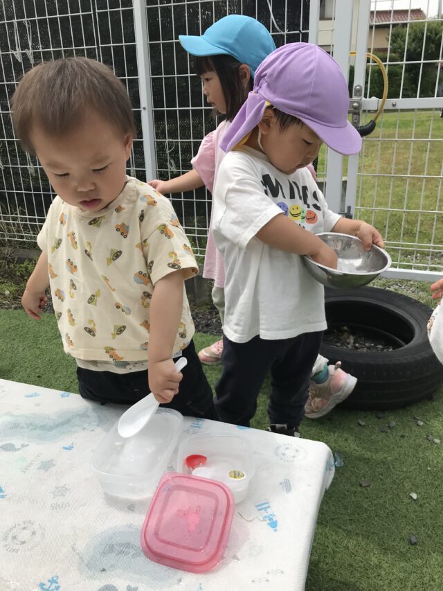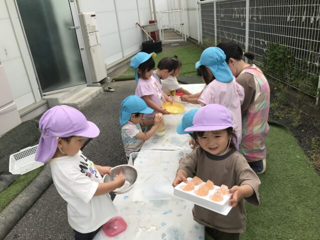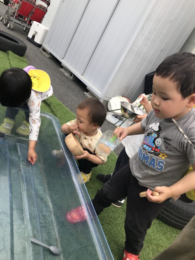 2025.05.18 保育園の日常、誉田保育園 氷の感触を楽しみました☆2歳児 丸い氷、オレンジ氷、大きい氷、色々な氷に興味津々! 触ってみよう~冷たいかな~? 水をかけたら、溶けちゃった~ 氷って不思議だね!