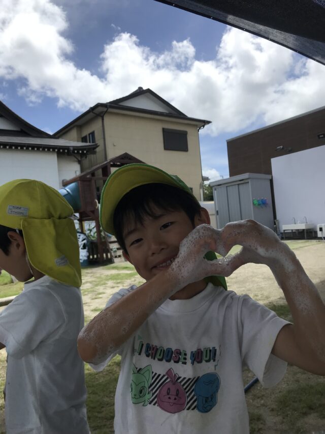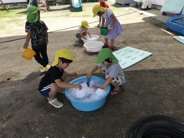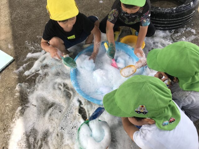 2025.07.21 保育園の日常、誉田保育園 泡・泡あそび☆4歳児 「ぐるぐるとかき混ぜたら、どんどん泡が出来てきた~」泡づくりに夢中です。 「ハートのシャボン玉♡」かわいい 「色もいれよう~」「おいしそうな 綿あめみたい~」 「ソフトクリームつくろうよ」美味しそうに出来てますね。