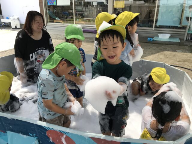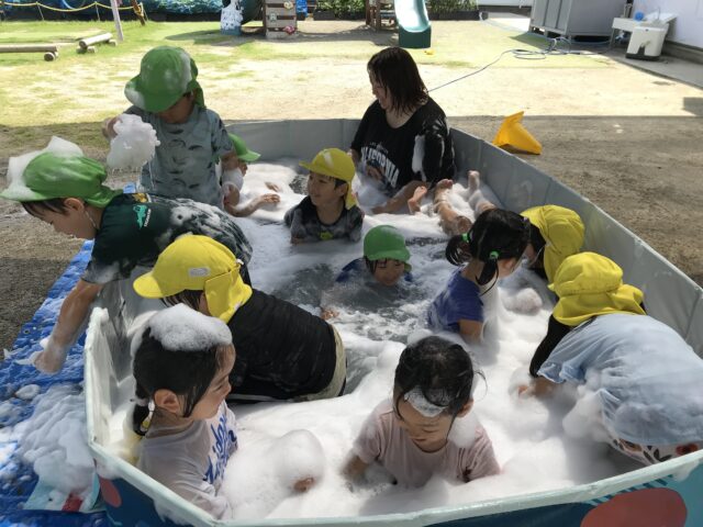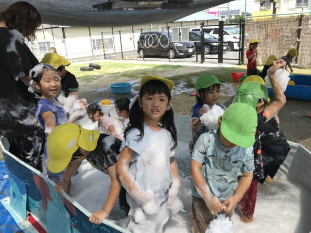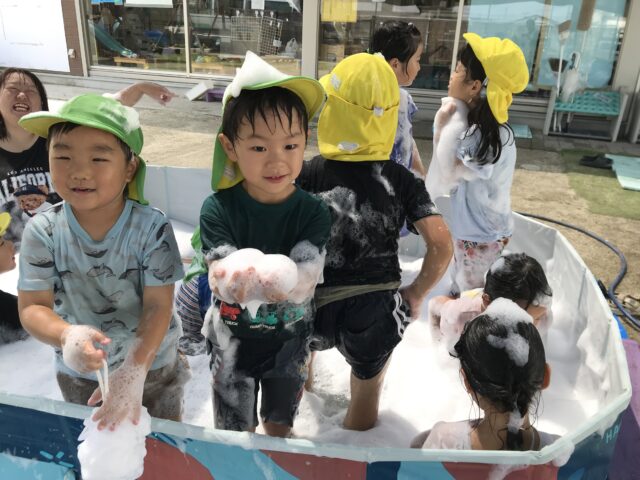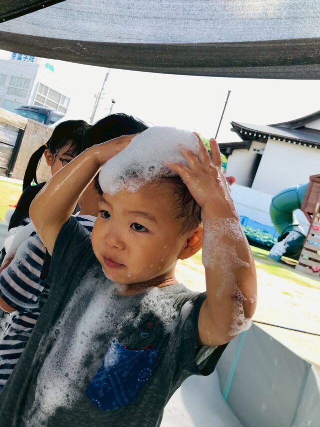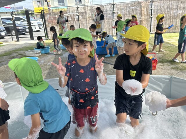 2025.08.25 保育園の日常、誉田保育園 泡遊び☆以上児 水遊びと泡遊びにわかれて、少人数で泡遊びを楽しみます 泡を怖がらずに泡パックまで!! 「みて~服にもつけてみたよ」 「泡がもこもこ!!持てたよ~」 「足でかきまぜて、もっとフワフワにしてみよう~」 「泡のお風呂、気持ちいいね~」全身泡まみれです。 「泡って伸びるの~落ちるかな~??」 泡のリーゼント!!「僕にあってる??」