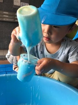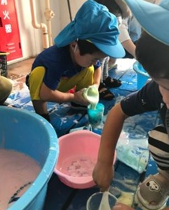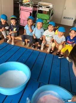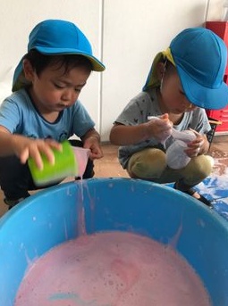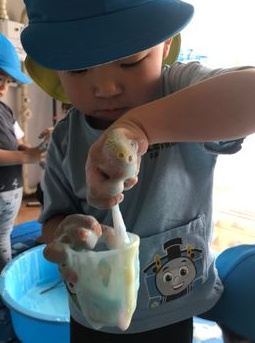2025.08.25 保育園の日常、菊名園 泡遊びグレードアップ! 今日は白だけじゃないぞ!2個ある~💕 ワクワク・ドキドキ💕 いちごみたい🍓 とろ~り💕美味しそう😊 混ぜ混ぜしてみる!研究熱心! カラフルジュースの出来上がり✨ 研究は、まだまだ続きます~ 研究にはたっぷりと! 熱中してました!泡の感触最高!を堪能していました!