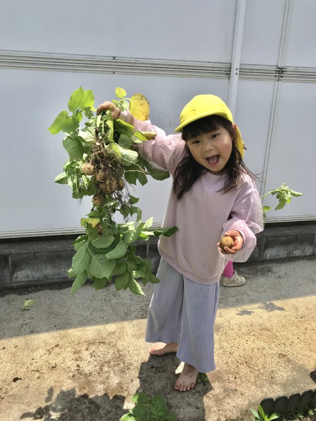 2025.05.31 保育園の日常、誉田保育園 畑でじゃがいも堀り☆4.5歳児 畑のジャガイモが大きくなったかな?毎日お水をあげて、草取りをして育ててきました。大きい組さんじゃがいも堀りに挑戦です 抜けた~~じゃがいも出来てるよ~~♪ 「こんなにジャガイモがついてるよ~」裸足で畑の中を歩き回り、頑張りましたね。 わたしのは、ちいさいんだけど~ 手を真っ黒にして頑張りました。 早く、食べたいんだけど~~ 大事なジャガイモです お風呂でゴシゴシ洗ったら、綺麗な色に変身です。 ポテトサラダ?ポテト?ふかし芋?美味しいものを作ろう!!楽しみだね。