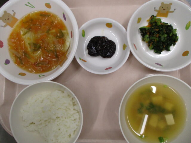 ご飯、カレイの甘酢炒め、小松菜ののりあえ、豆腐のみそ汁、プルーン