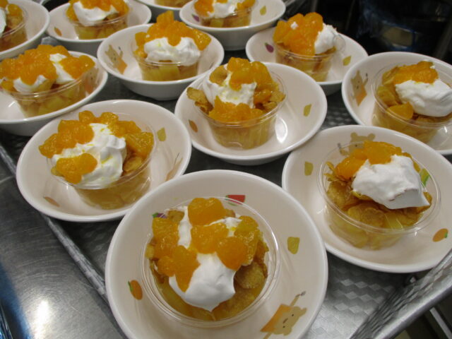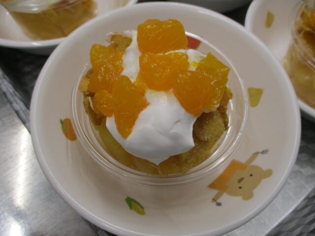 おやつのみかんパフェは、中にオレンジゼリー・コーンフレーク・豆乳クリーム・みかん缶を乗せて飾り付けをしています。