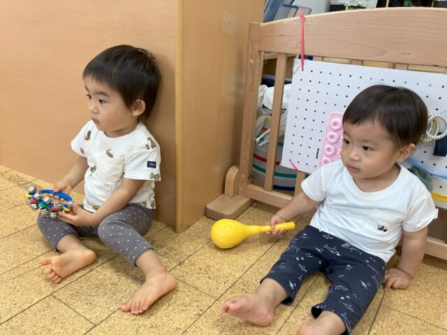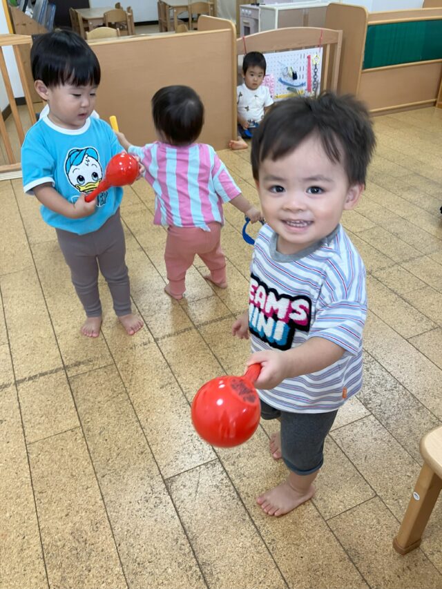 2025.09.22 保育園の日常、西馬込小規模保育園 秋の音楽で遊ぼう 今日は楽器遊びです。楽器が出てくると手を伸ばして早くやりたそうな子どもたち。鈴とマラカスの好きな方を選んで行いました。 「虫の声」など秋の音楽をかけて楽器を鳴らしましたよ。メドレーだったのですが、「七つの子」がかかるとじっくり聴きいっています。ゆったりとしたメロディーにリラックス。 最後はミュージックパッドを出して遊びましたた。「ドミソ」など和音が鳴ります。足踏みをしてたくさん音を鳴らして楽しんでいます。