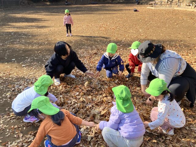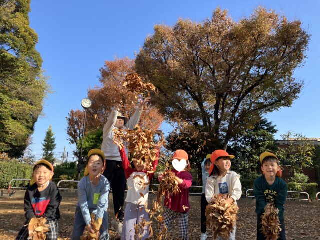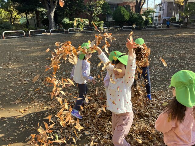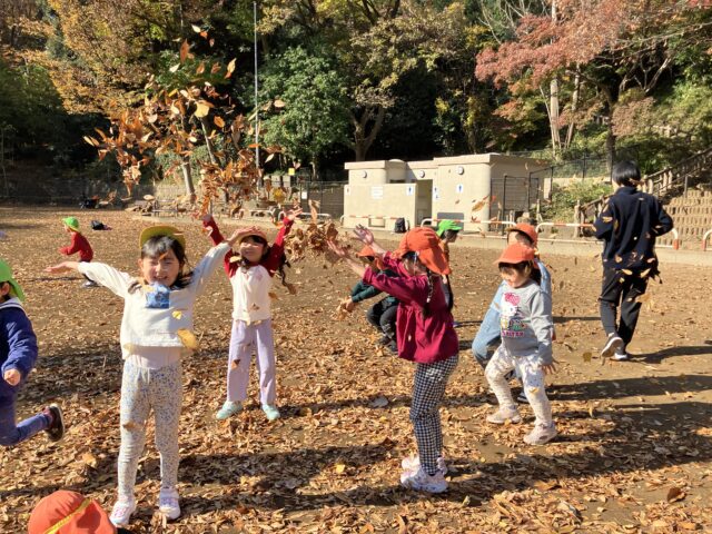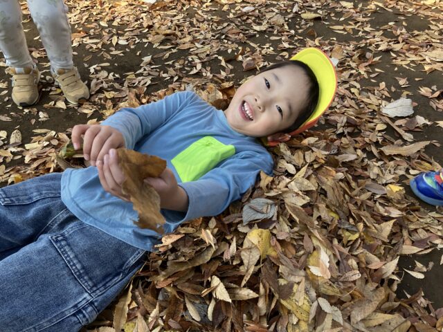 色とりどりの落ち葉を拾ったり、落ち葉の山に飛び込んだり、秋ならではの遊びを満喫!