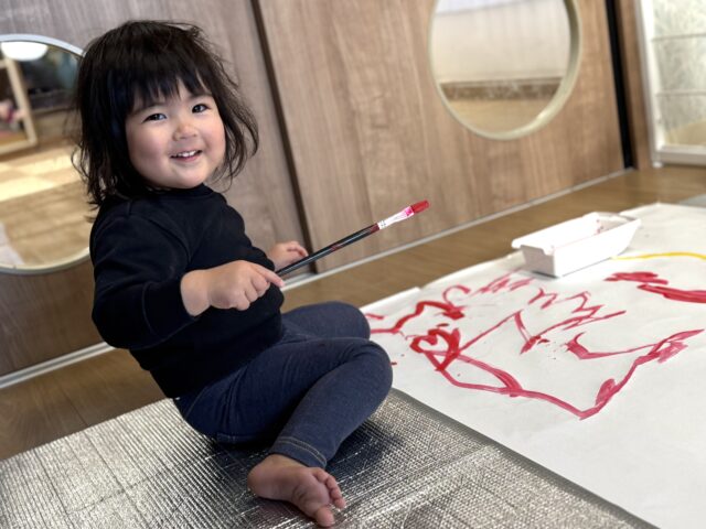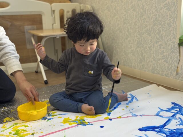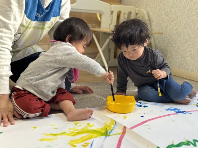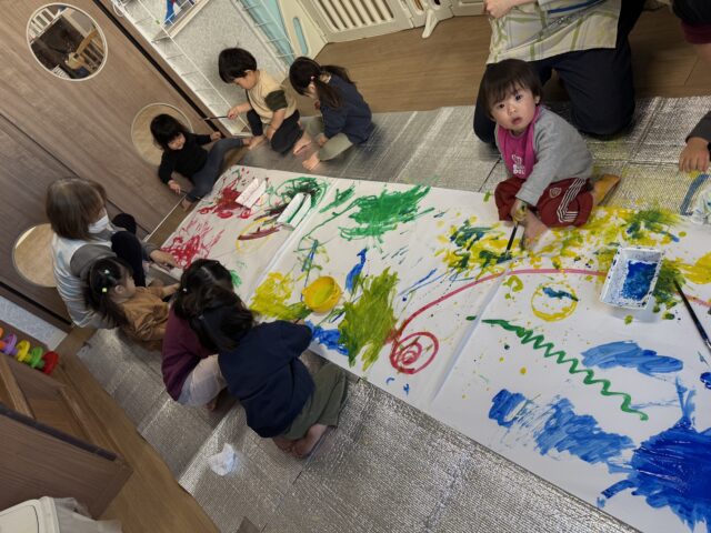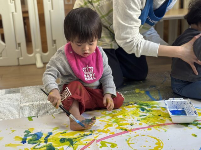 1歳児のおともだちも参加♪ 芸術作品ができました♡手も足も顔も、絵の具だらけ・・・♡筆を使い、描く楽しさ、色の混ざり合い、感触を楽しんだね♪