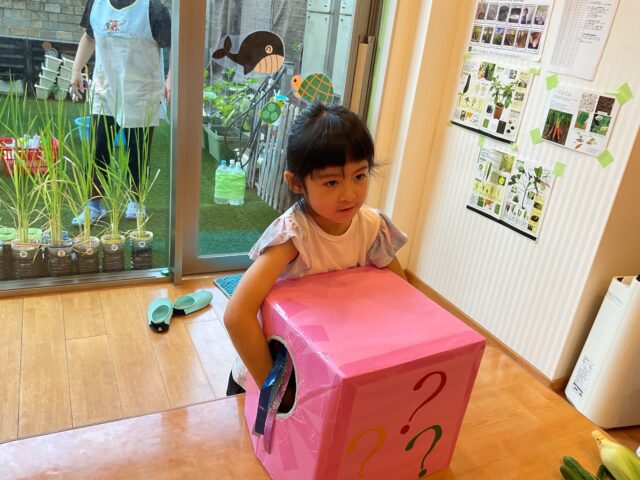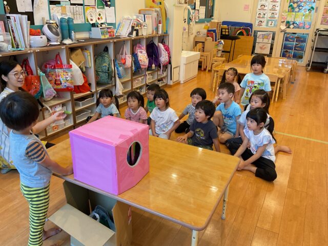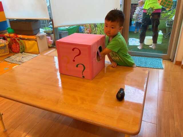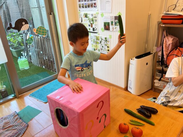 2025.08.22 保育園の日常、東葛西園 箱の中身はなんだろな? 今年もでました、謎BOX! 箱の中に入ってる野菜を見ないで当てていくよ~ ヒントを聞いて 正解したかな? 冷蔵庫から出したて野菜だったから、第一声はみんな【つめた~い】でした💦