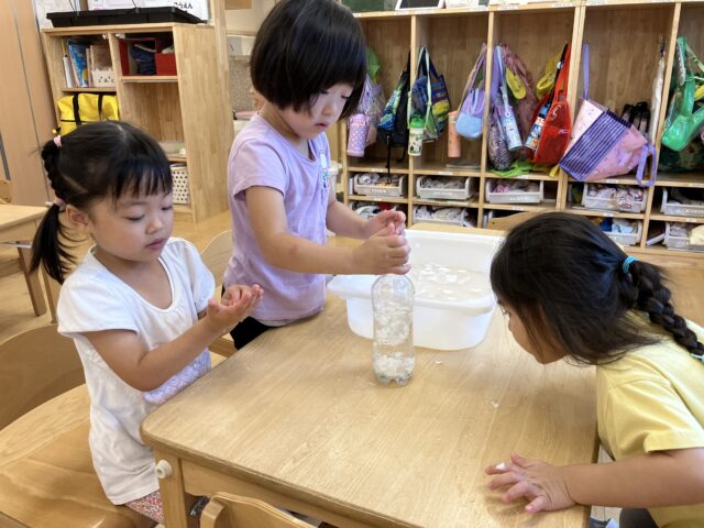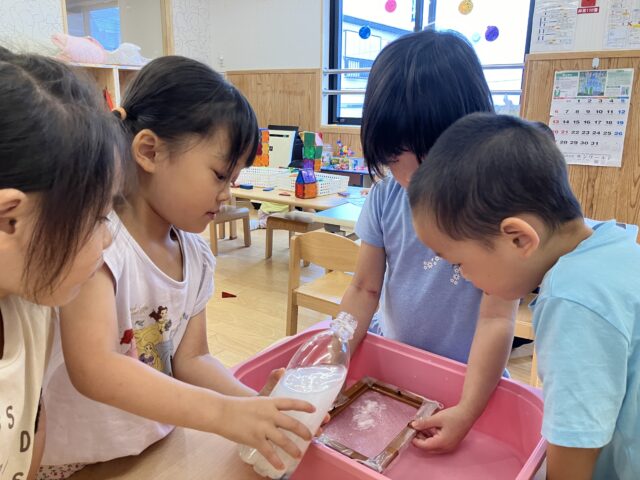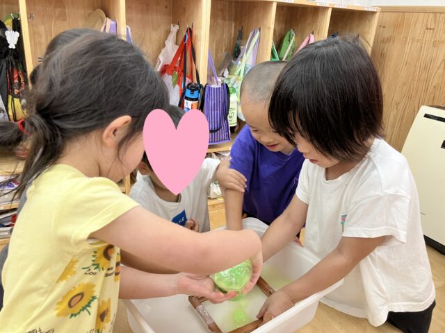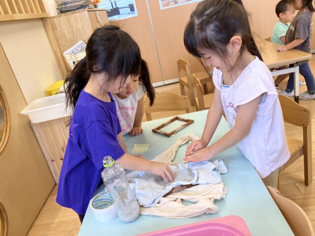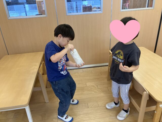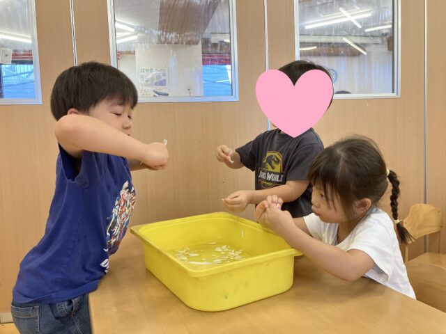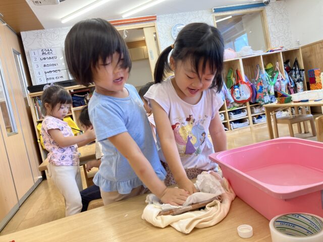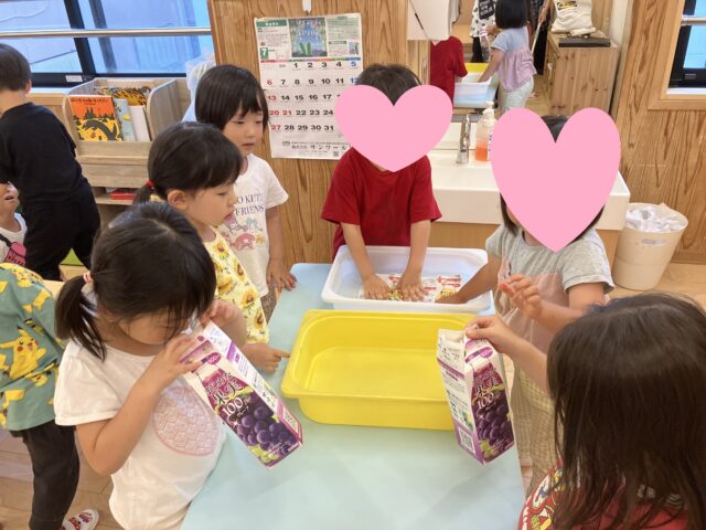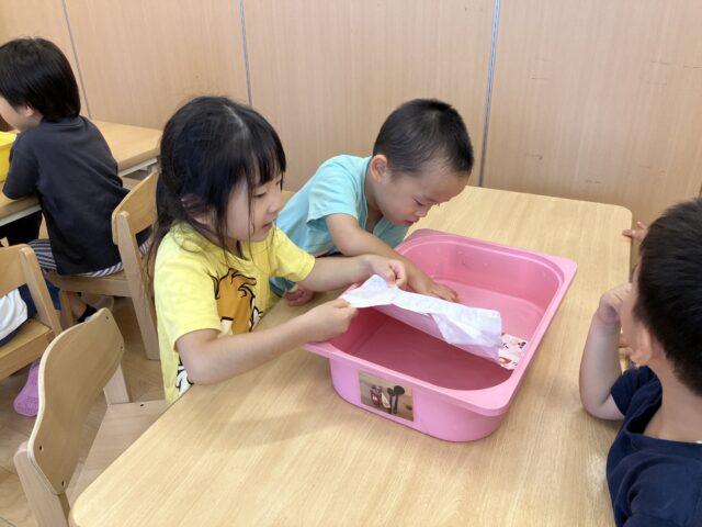 4歳児クラス(にじ組さん)で何やら紙パックを水にさらしていましたよ!