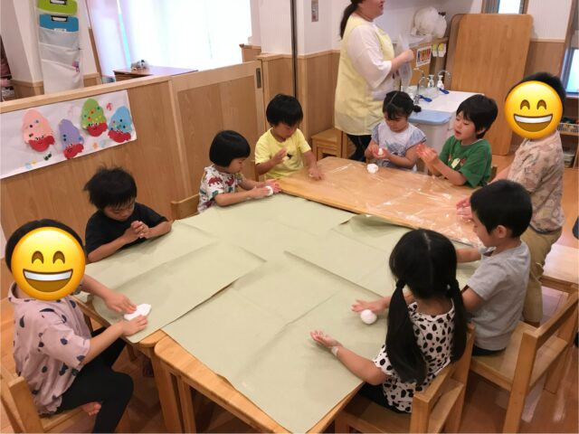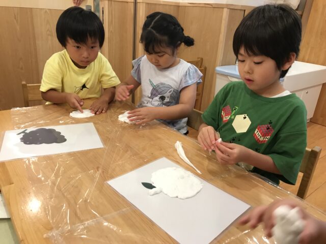 まずは紙粘土の感触を楽しみながら、団子やヘビ等、自由に作りました。