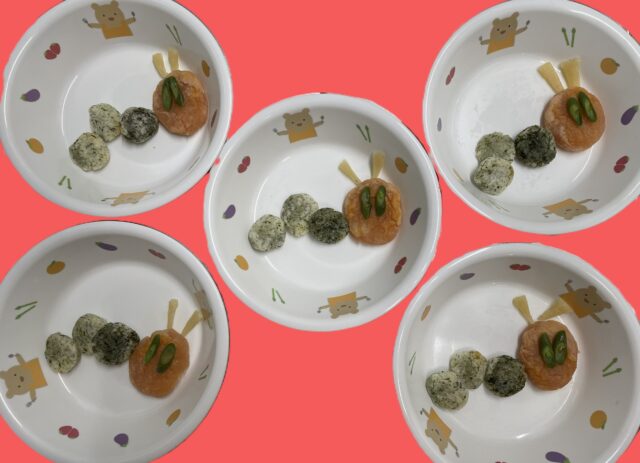おやつの芋もちを🐛はらぺこあおむしにしてみました😄