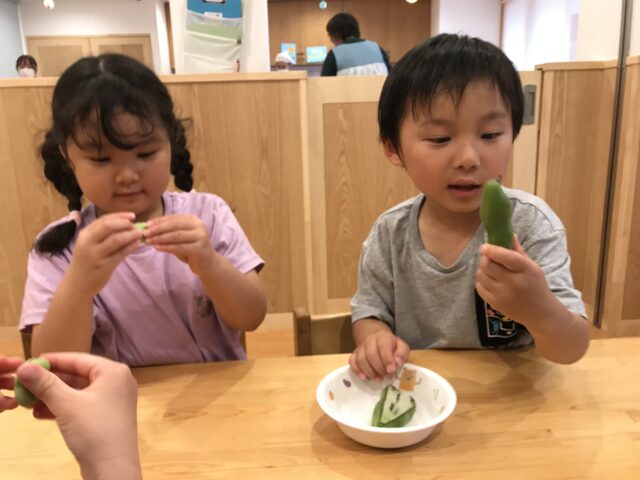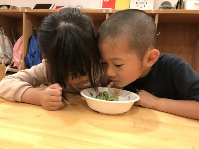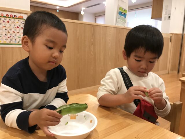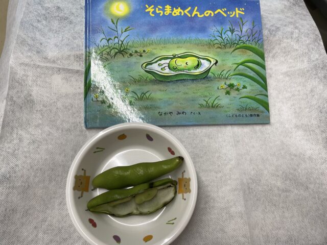 絵本を見た後は、そら豆を五感で楽しみ「いいにおい♡」「ツルツルしているね〜」等、感じたことを伝え合っていましたよ!