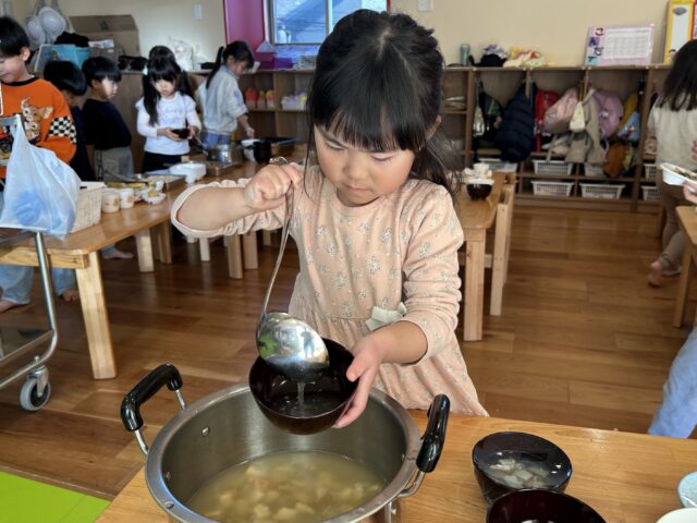 4歳児すみれ組では、年明けからご飯と汁物の配膳を自分で行っています。