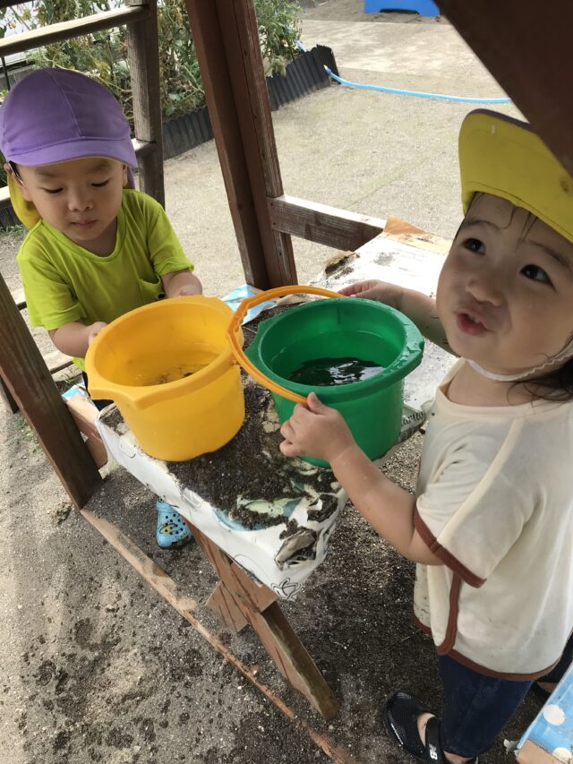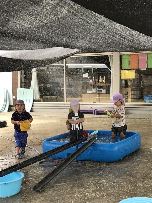 2025.08.31 保育園の日常、誉田保育園 色水遊び☆2歳児 色水ジュース屋さんごっこが始まりました。「いらっしゃいませ~」可愛らしい店員さんです 「ここは何屋さんかな??」 「ホース遊びも楽しいよ~」 雨どいに水を流すのも面白い。。 つかった後は片付けます!!持ち方がさまになってますね~ 沢山遊んで、いっぱい食べて、ぐっすりとお休み~~