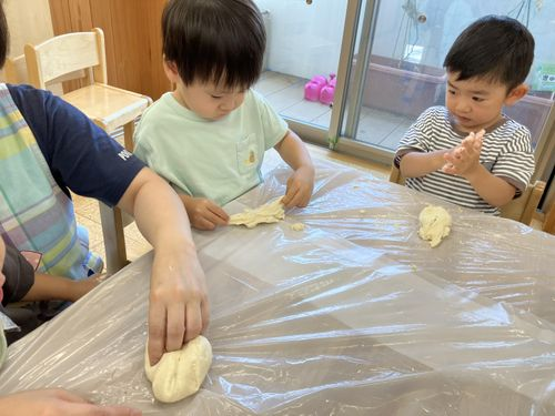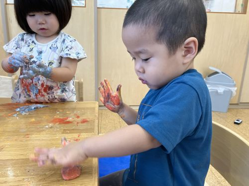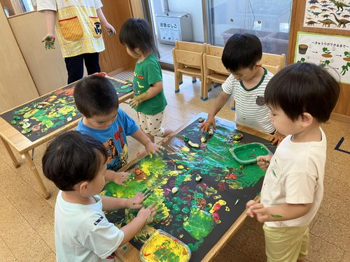 2025.07.24 保育園の日常、北千束園 花火を作りました! 小麦粉粘土を丸めたものを絵の具をつけてスタンプにしました。 製作の前に花火の動画を見て、イメージはバッチリです。 素敵な花火が出来上がりました!