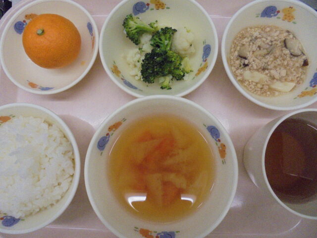 御飯、豆腐のそぼろきのこあん、ボイル野菜、だいこんのみそしる、みかん