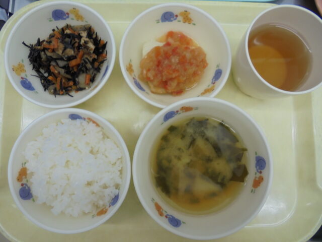 ごはん、かれいのさっぱり甘酢ソース、ごぼうとひじきの炒め煮、じゃがいものみそ汁