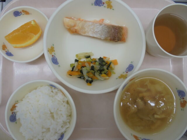 御飯 さけのムニエル、野菜炒め、キャベツのみそ汁、オレンジ