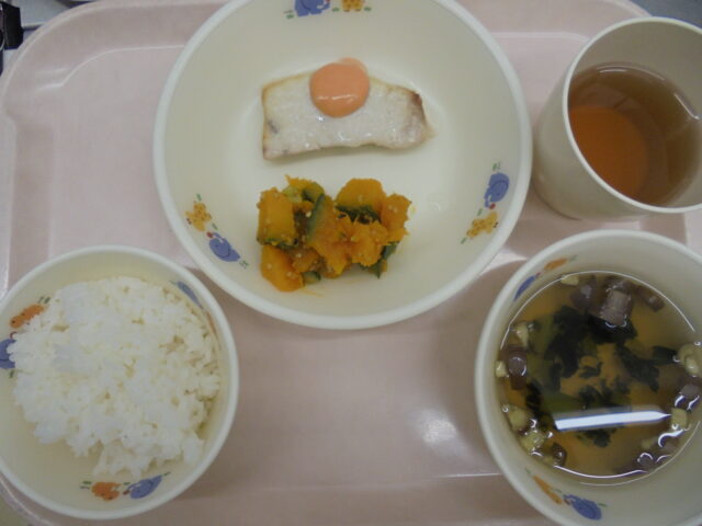 御飯、かじきのオーロラソース、かぼちゃのごま酢和え、なすのすまし汁