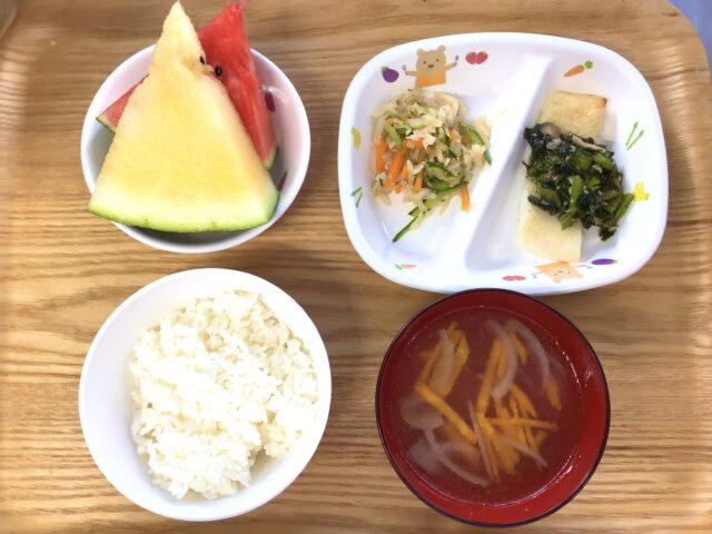 2025.08.22 ある日の給食 蓮沼園 給食 ご飯、かれいの中華蒸し、切干大根のごま和え、はるさめスープ、すいか 赤と黄色のすいかの食べ比べしました。乳児クラスは種をとり3㎝角に切ったスイカのシャリシャリした食感を楽しみながら、幼児クラスは赤と黄色を交互に食べて味の違いを感じながら。夏の思い出がまた一つ増えました。