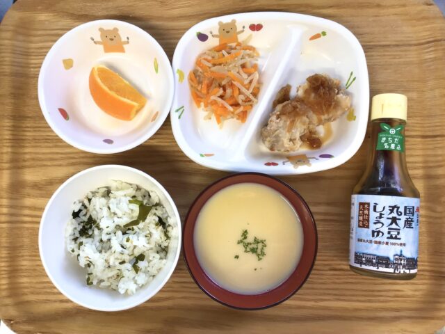 9月の職員リクエスト給食です。子どもたちに人気の油淋鶏には国産丸大豆で作られた「日本一しょうゆ」を使用しました。わかめご飯にコーンスープと、子どもたちが大好きなメニューばかり。「おいしい」「おいしい!」「おいしいー!!」と大満足な様子でした。