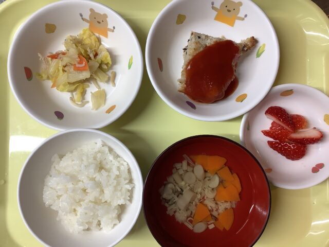 ご飯、ミートローフ、白菜のしらす和え、きのこのスープ、いちご