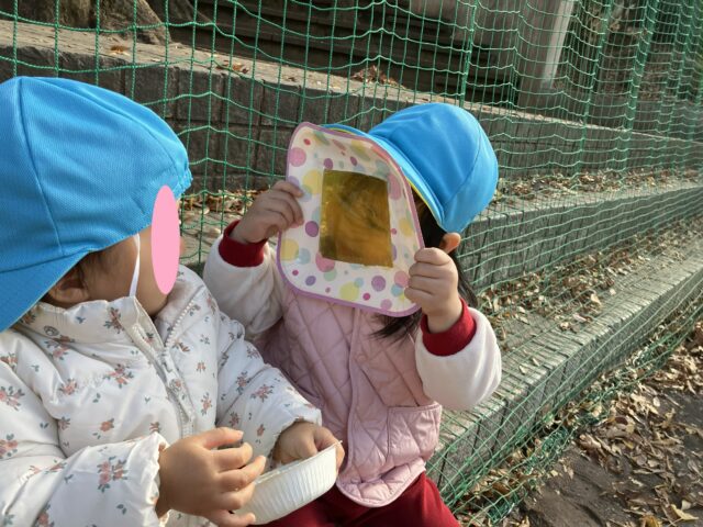 2025.12.9 保育園の日常、西馬込小規模保育園 見て~見て~ 1歳児クラス うわ!すごいよ 黄色い!! 見て~見て~ ほら! 見てごらんよ 黄色いね~ 自分が見て面白かった事をお友だちにも ほら、みてみて と楽しさの共有。 素敵な場面に出会えました。
