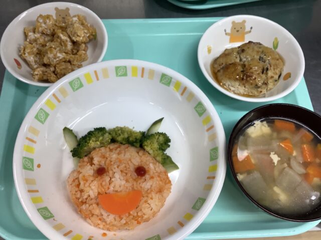 2026.02.13 ある日の給食 誉田園 給食 赤鬼ライス★節分、豆腐ハンバーグ、けんちん汁 ケチャップライスと茹で野菜で用意したパーツをそれぞれ提供しました。好きな野菜を乗せていろんなお顔の赤鬼が完成! 苦手な食材も、いつもよりたくさん食べられました。「ねえ見て!」が溢れていました。
