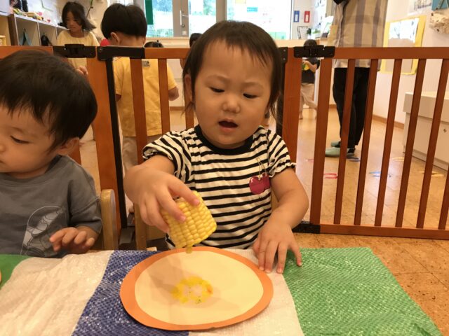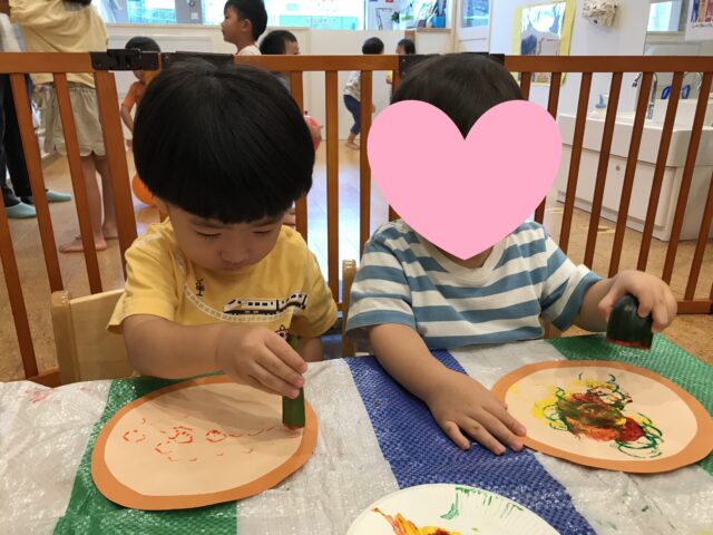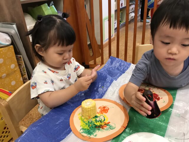 やどかり組さん、昨日さわった野菜を使ってスタンプ遊びをしたよ~