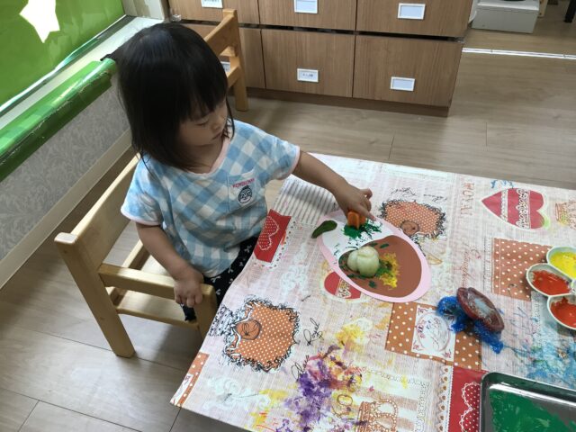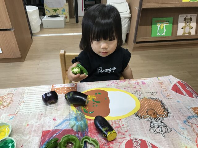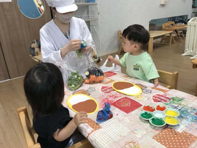 2025.07.21 保育園の日常、誉田保育園 野菜スタンプに挑戦☆1歳児 野菜に触れて、遊んでみよう。オクラの匂いやピーマンの感触に触れながら、7月の製作を作りました 「これは何?」給食の先生がお野菜を沢山もってきてくれました。 「ピーマン、ペタペタ」いろんなスタンプの形ができてます 「星形の人参がお気に入り~」ペタペタ楽しそうです 個性豊かで美味しそうなカレーライスが出来上がりました。野菜がいっぱい入りましたね。