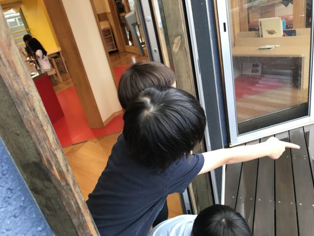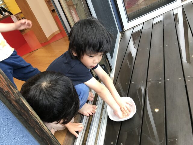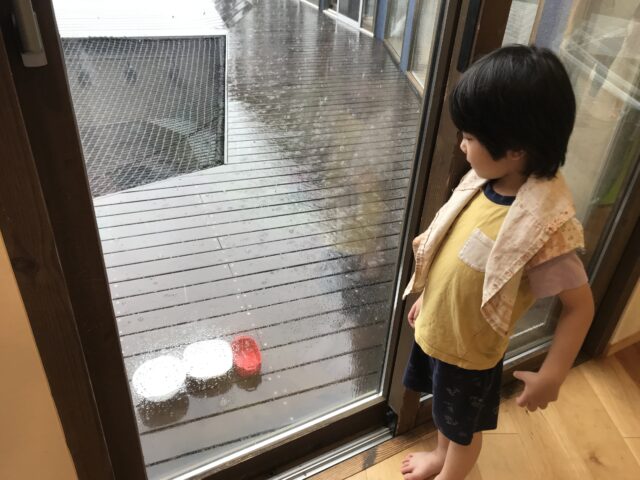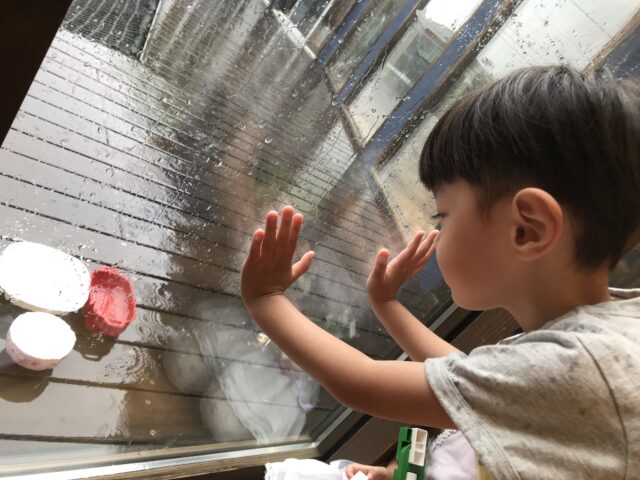 2025.07.2 保育園の日常、南流山認定こども園 雨、溜まるかな? 雨の日が少なかった6月ですが、室内からも雨の様子を観察して楽しみました。 お弁当箱はいっぱいになったら蓋閉めようよ! あ、段々いっぱいになってきた! 数十分おきに、みんなで何度も何度も様子を見ていました。 触ってみたら、冷たーい 虹が見えた!水たまりに反射した窓が虹色に輝いていました。
