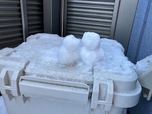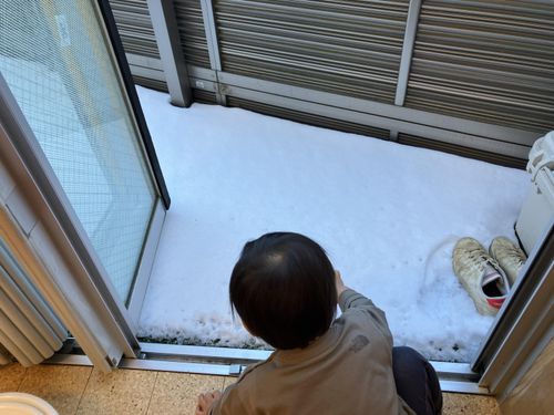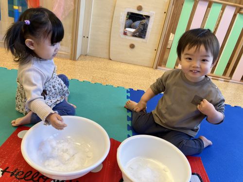 0歳児クラスの裏庭には、まだ雪が少し残っていましたよ。