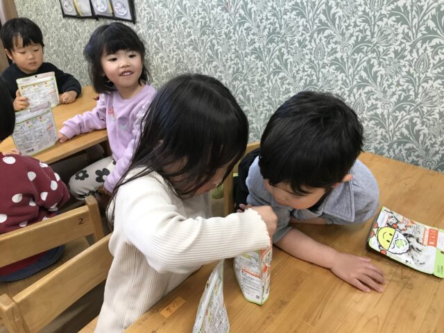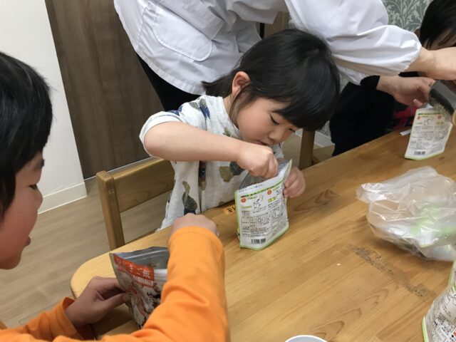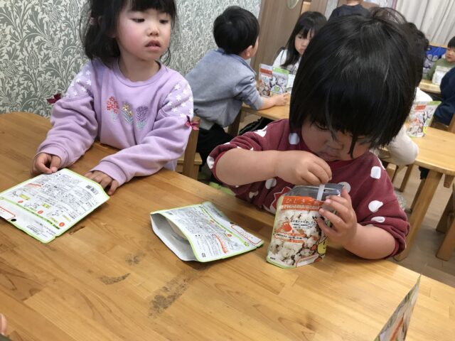 2026.03.28 保育園の日常、誉田保育園 非常食ってなんだ?!3歳児♪ 非常食ってなんだろう・・・保育園で給食が作れない時に食べてみる非常食に興味津々♡そこで非常食を実際に食べてみることに・・・♡ 給食の先生に、お湯を入れてもらい、スプーンでまぜまぜ~♪おいしくなーれ♪ なんだかいい匂いがしてきたね♪ 「みせてーみせてー」「ごはんになってるね・・・」 「ぱくっ」美味しいね♪ 非常食とは何か…のお話を給食の先生から教えてもらい、非常食の大切さを知れてよかったね♡