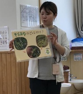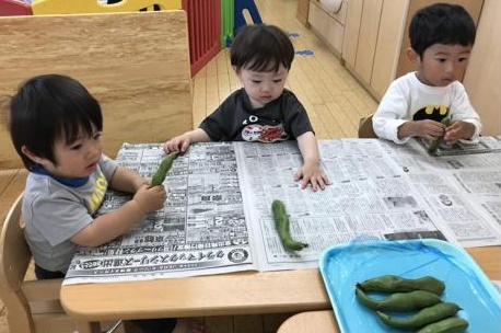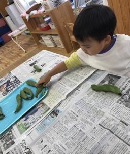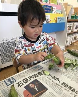 『そらまめくんのベッド』のお話をみんなで見た後に、本物の『そらまめ』に触れました。