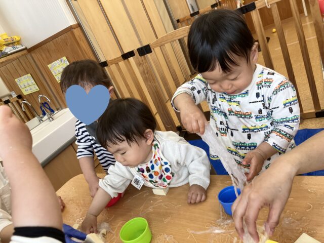 片栗粉スライム遊びで盛り上がり、切り上げることが大変な姿もありました。