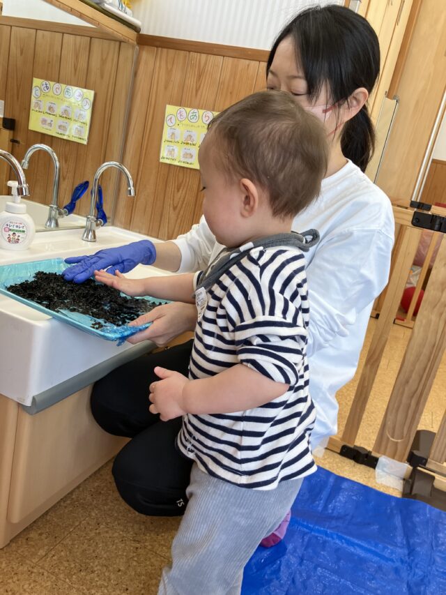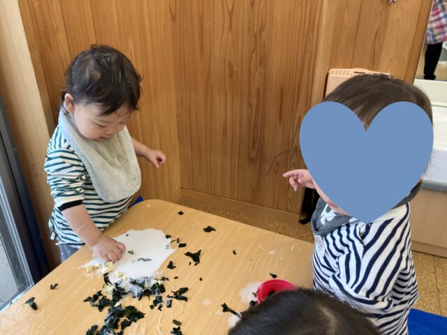 それでも、高野豆腐を突いてみたり、保育者と一緒に匂いを嗅いでみたり、ワカメは乾燥した物が柔かくなる感触を感じました。