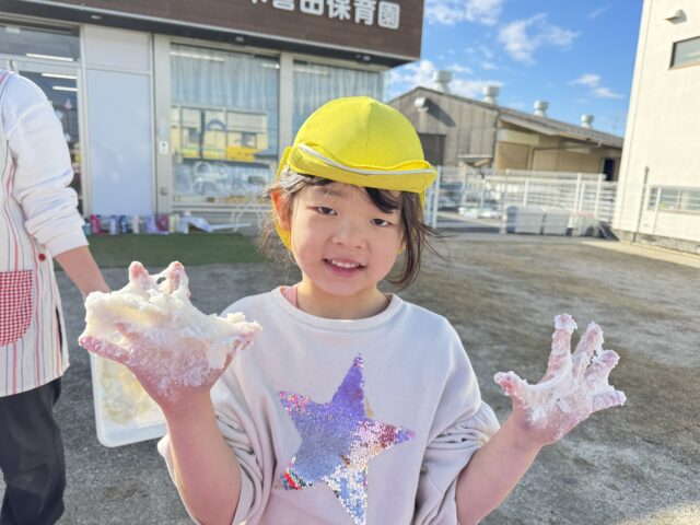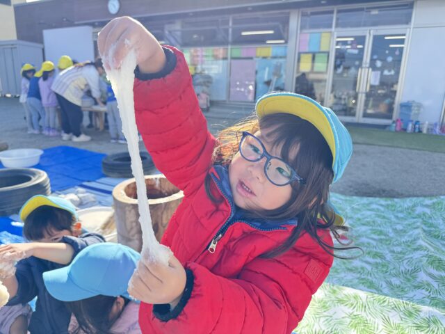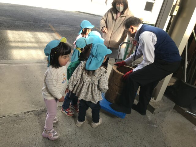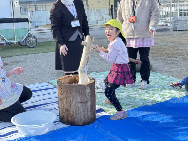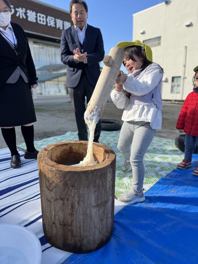 2025.12.31 保育園の日常、誉田保育園 餅つき会♪以上児♪ 毎年、恒例、餅つきをするのにお隣のJAさんに、うすときねを借りにいきました♪台車に重たいうすときねを乗せてもらいました♪「もちつきたのしみ~!」と興味津々なこどもたち♡ 楽しみにしていた餅つき会の当日♡給食の先生が朝早く、もち米を用意してくれました。まずは、もち米の匂いをかいでみる事に・・・♪「お米のにおいだぁ!」「ちょっとくさいっ」と匂いを楽しみました♡ 最初は、ゆり組からスタート!店長さんと一緒にやってみたよ♡ 「みてみて~おもちが伸びてる~♪」 みんながついたおもちを触ってみる事に・・・♪もっちもちの感触を思う存分楽しんでいました♪ 「みてみて~手にくっついた、おもち♪」やわらかくなった、おもちの感触を長い時間、触っていました♪ みんなで丸めたおもちが鏡餅に感動♡次は鏡開きを体験しようね♡