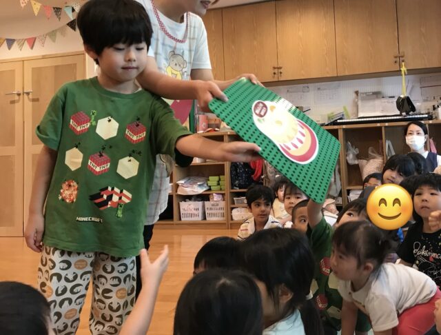 保育者による出し物では、9月生まれのお友だちに協力してもらって、美味しそうなフルーツケーキを作りました🥝🍊🍍🍓