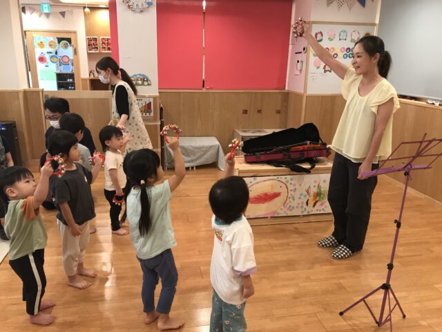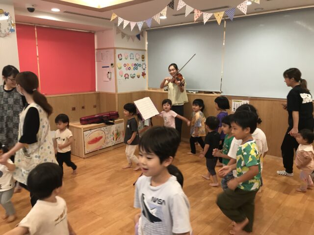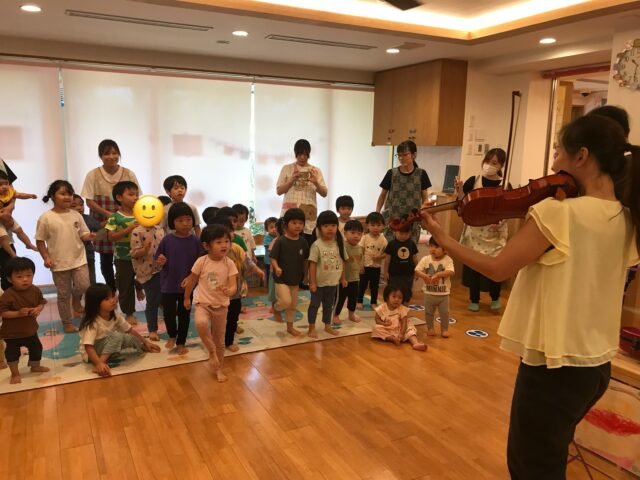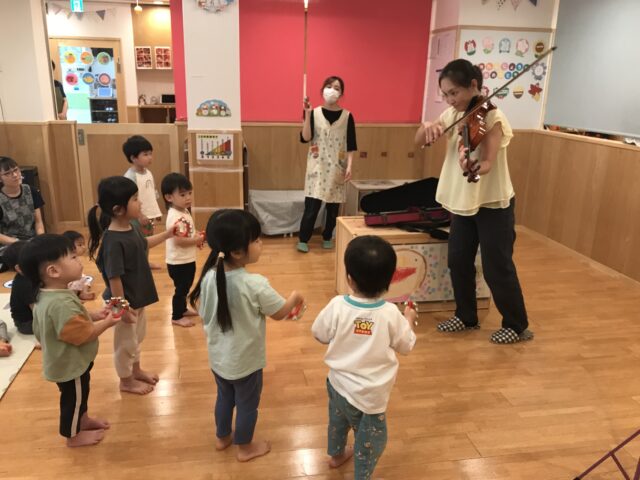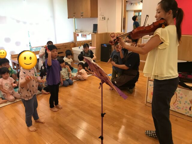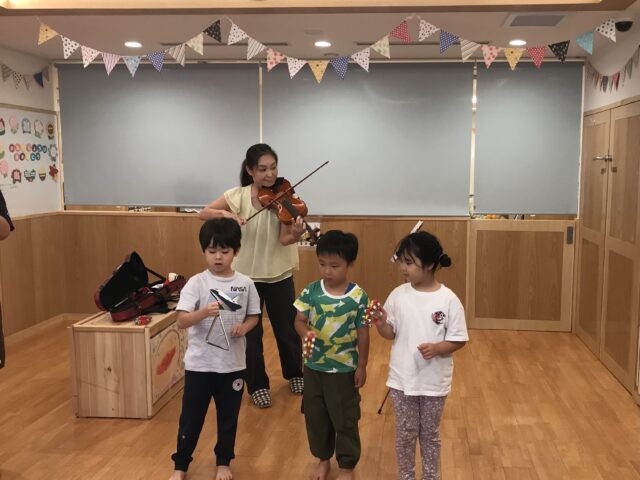 前回の話を覚えていて、バイオリンの弓は馬のシッポの毛でできていると答えていましたよ!バイオリンの音色に真剣に聴き入る子どもたち、音楽の魅力を感じている様子です💕