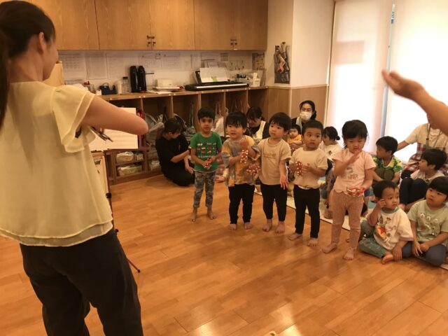 めろん組(4歳児)、ぱいなっぷる組(5歳児)は難しいリズムもバッチリ!ぱいなっぷる組はトライアングルにも挑戦しました!とても上手に演奏していましたよ♬
