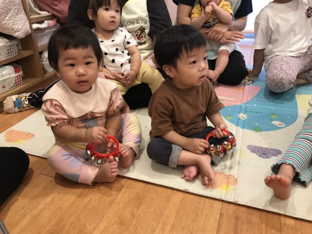 鈴の鳴らし方を教えてもらい、一緒に演奏をしました♬ まずは、りんご組(2歳児)さん!