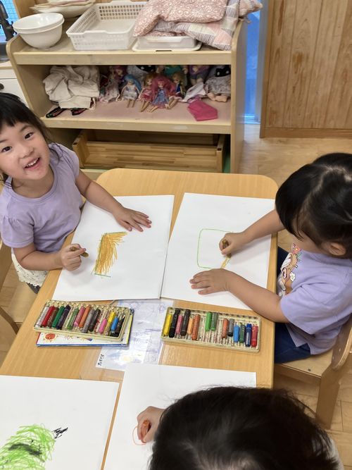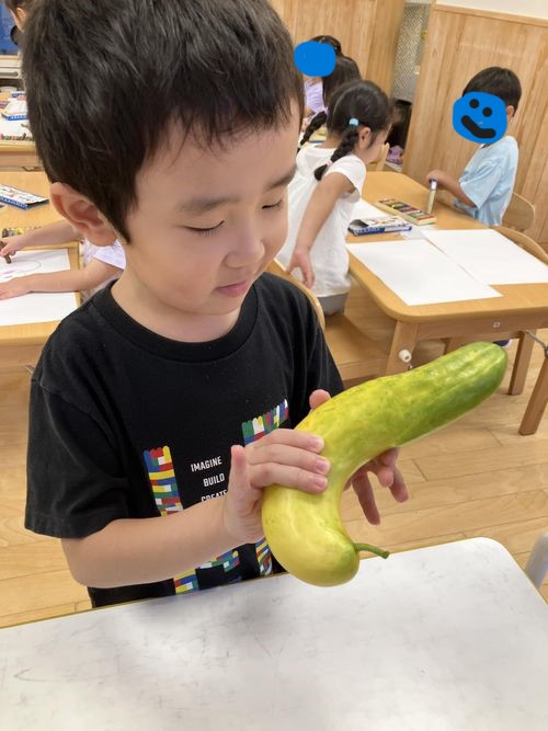 2025.07.16 保育園の日常、西馬込駅前保育園 きゅうりをよく見てみよう! 年中クラスぞう組さん。 屋上園庭で栽培したきゅうりがとっても大きくなりました。 収穫をし、みんなで観察です。 つるつる、おおきい、 みんなで毎日水をあげて大きくなったね。 手にすると笑顔になっていました。 よーくよーく観察。プランターはこんな形!どんな絵になったかな?お楽しみに♪