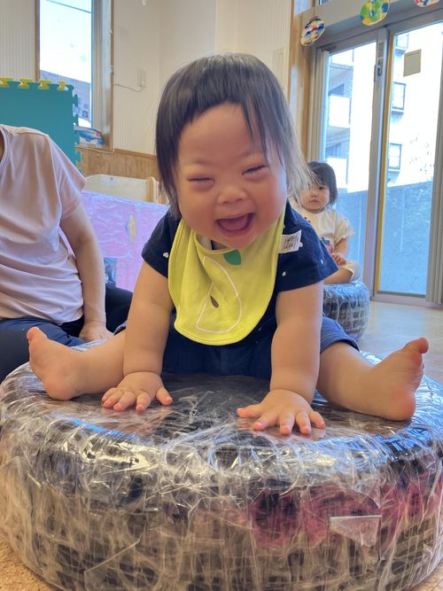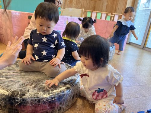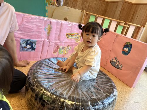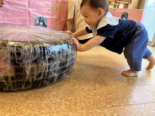 0歳児クラスは手作りのタイヤ太鼓で遊んでみました。