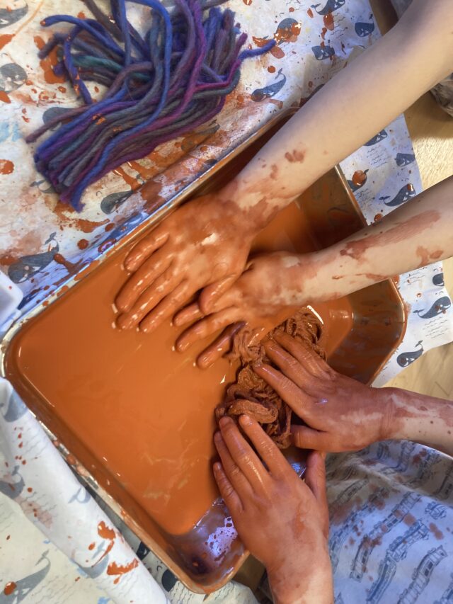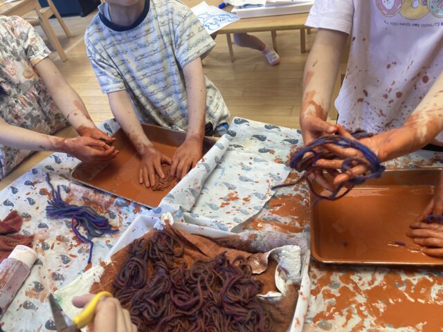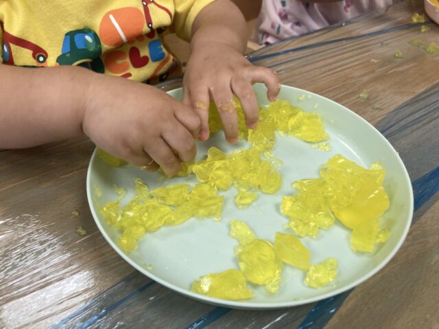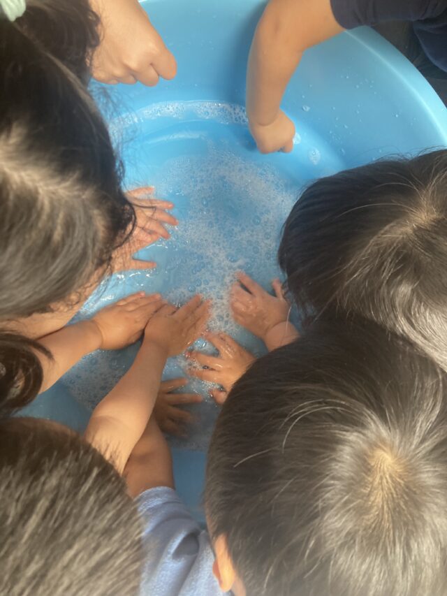 2025.07.30 保育園の日常、西馬込駅前保育園 手、手、手、いろんな手 何をしているのかな? らいおん組(5歳児)は夏祭りごっこの焼きそば作り ソースをたっぷり! ぱんだ組(3歳児)は泡遊び ぶくぶく あわあわりす組(1歳児)は寒天遊び やわらかめ。 固め。 いろんな感触、いろんな手!