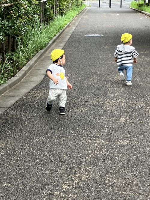 2025.08.12 保育園の日常、西馬込駅前保育園 初めての靴、走る走る! ひよこ組、今日は涼しいので遊歩道へ♪ あっ! 新幹線発見! 新幹線、見に行くぞー! まてまてー! ん!? えっ!?そっち!? 二人であっちこっち歩いたり走ったり 靴でお散歩、うれしいね!