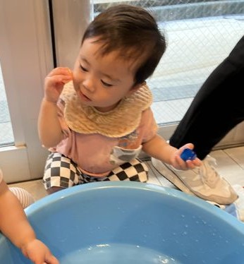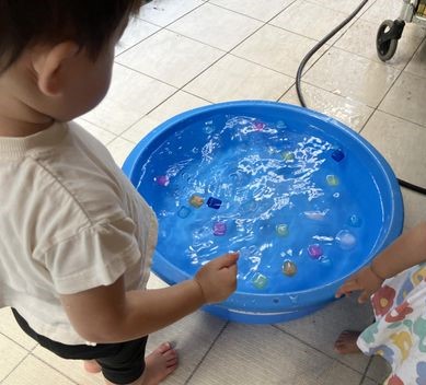 本日の1歳児クラスの水遊びには大きな丸い氷とアイスキューブが登場!✨