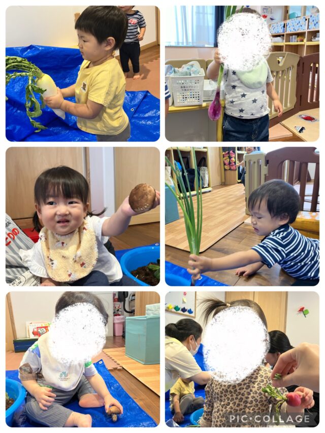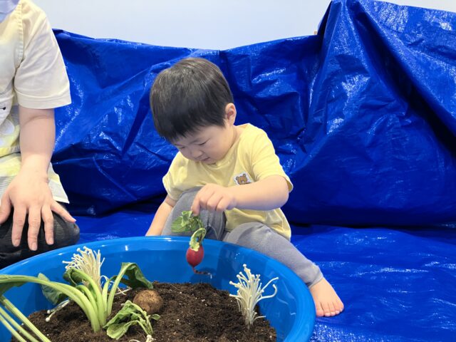 2025.05.28 保育園の日常、水天宮前園 食育 【食育】野菜掘り🥕 1歳児クラスの食育で、野菜掘りをしました! 人参や大根、じゃがいも、かぶなど 様々な野菜が土の中に入っています🥕 土の中からお野菜が獲れたよ!! 今日の給食に入っている野菜はどれかな😋?🍽️ 野菜の感触も楽しんでいたお友だちです😊