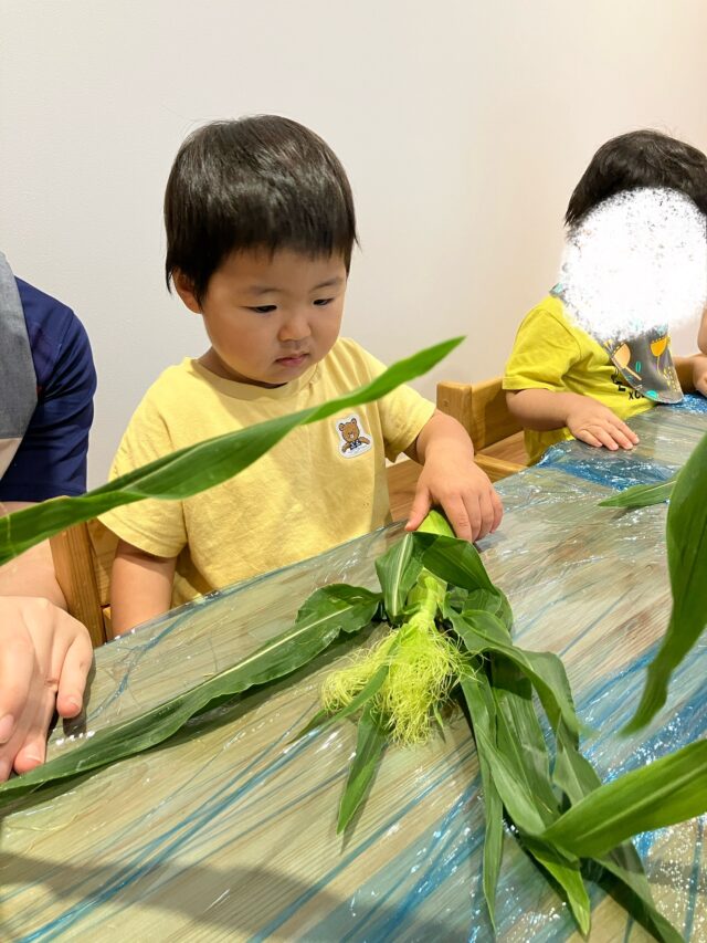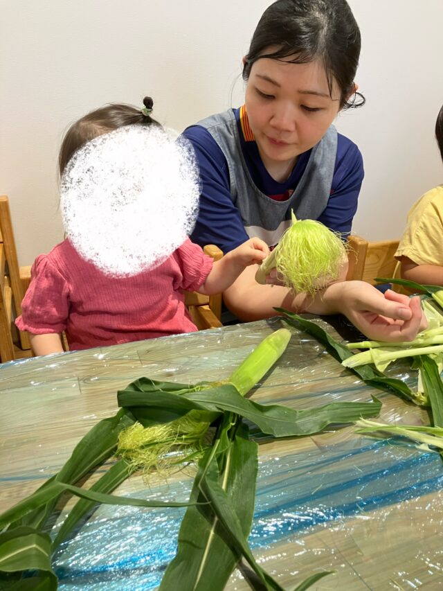 2025.07.10 保育園の日常、水天宮前園 【食育】ヤンングコーンの皮むき 1歳児クラスの食育で ヤングコーンの皮むきを行いました🌽 ヤングコーンに興味津々🌽 「皮むきやってみるよ!」 黄色のコーンが出てきた!周りに付いているおひげの感触もおもしろいね! コーンの粒を一粒ずつ取り出してみたよ! 皮が全部むけたよ!ヤングコーンを電車に見立てて遊んでいました🚃 皮のベッドでコーンが寝ているね! 指でつんっ!と触ってみました☝️粒々の感触がおもしろいね! 一人ひとりの興味や、発見が楽しい食育でした🌽✨