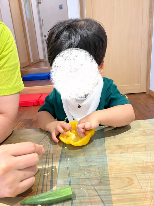 オクラをクレヨンに見立てて、お絵描きを楽しんでいました😆🖍️