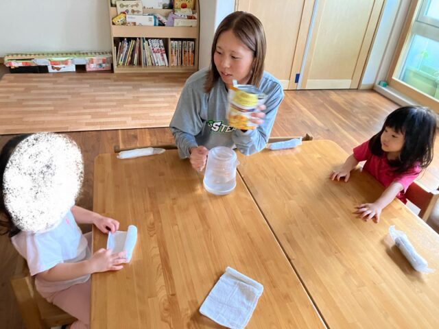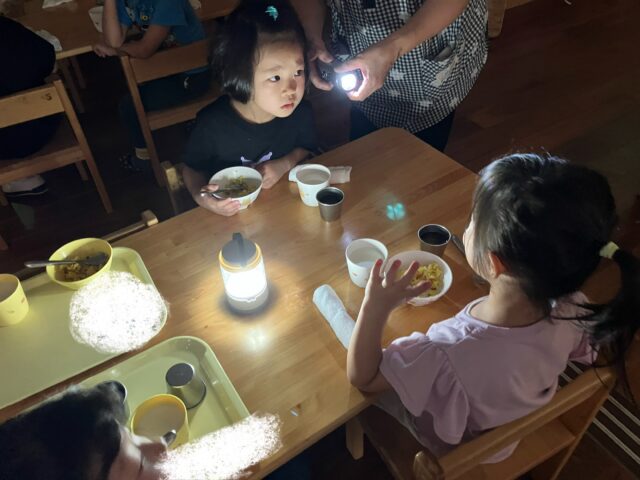 この日のおやつは、模擬体験として、部屋の電気を消し、非常用の懐中電灯やランタンの明かりだけで食べてみました💡